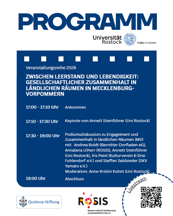 Unser Podium besteht aus: Andrea Boldt (Bernitter Dorfladen eG), Annalena Ulherr (ROSIS), Annett Steinführer (Uni Rostock), Iris Peinl (Kulturverein K-Drei Fuhlendorf e.V.) und Steffen Saldsieder (SKV Yamato e.V.). Anne-Kristin Kuhnt (Uni Rostock) führt euch als Moderatorin durch den Abend.